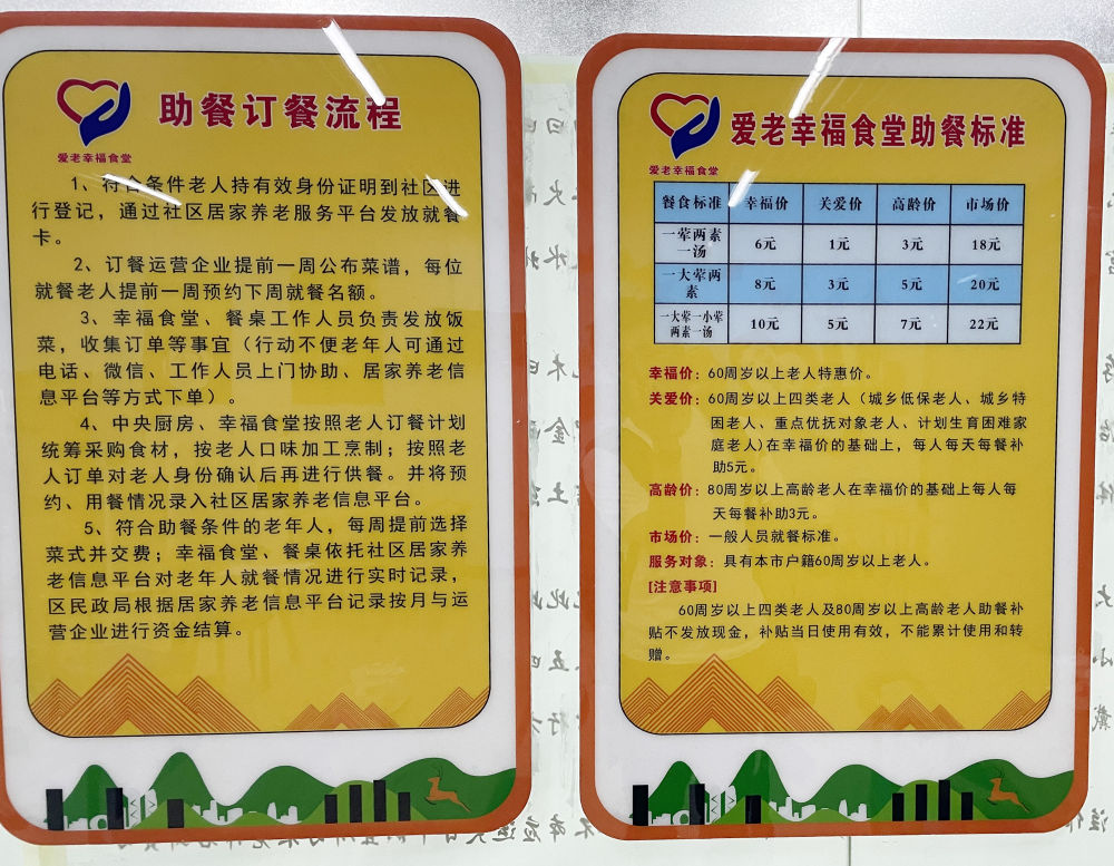 这是文亭巷社区幸福食堂里张贴的订餐流程和助餐标准。