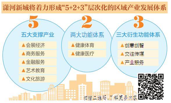 根据规划区域定位,潇河新城将着力形成“5+2+3”层次化的区域产业发展体系。“5”是形成会展经济、商务服务、金融服务、艺术教育、文化旅游五大支撑产业。“2”是发展健康体育、健康医疗两大功能体系。“3”是构建创意创智、交往传媒、产业服务3大衍生功能体系。
