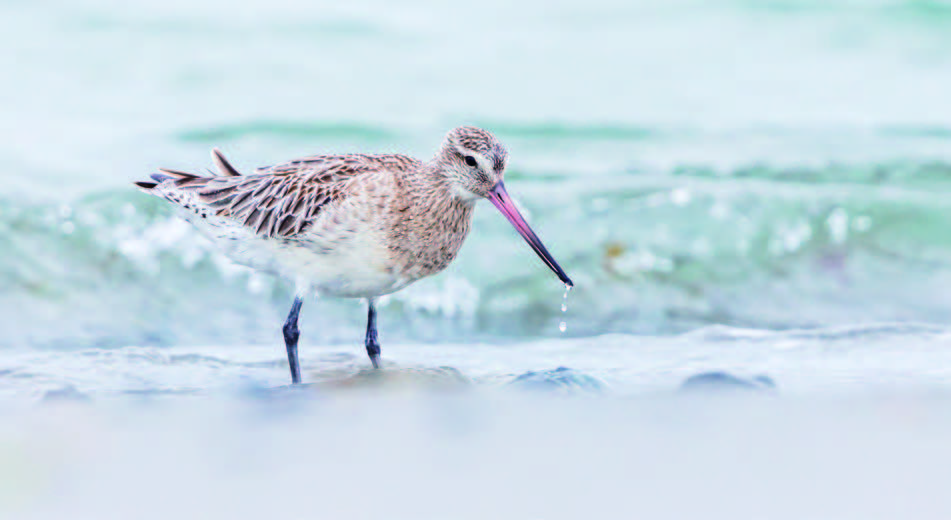 满身细碎斑纹的斑尾塍鹬,拥有一个稍微上翘的奇特长喙。体重只有0.5千克左右的它们是一群海滩上的小美食家,泥沙中的蠕虫和鱼虾蟹螺是它们永远追逐的美食。