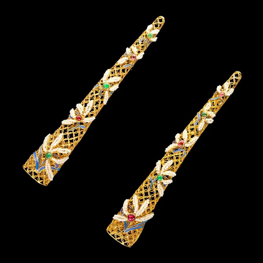 金,珍珠,松石,青金石;长5.8cm,宽2.5cm