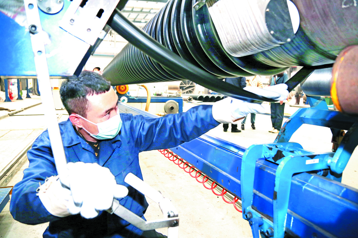 3月31日,太原亚明管道技术有限公司工作人员正在车间工作。该公司是一家集研发、生产、销售、安装、维修和生产技术服务于一体的高新技术企业。公司自主研发的双工位缠绕免切削的创新技术和工艺控制系统、全自动PLC系统控制的自动切削等装置与技术,引领中国缠绕管技术设备的最新发展,在国内外均处于领先地位。