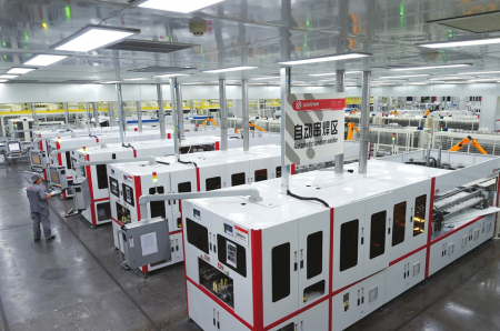 4月12日,山西省长治高新区潞安太阳能科技公司生产车间,机器人正高度自动化生产高效半片双玻组件。