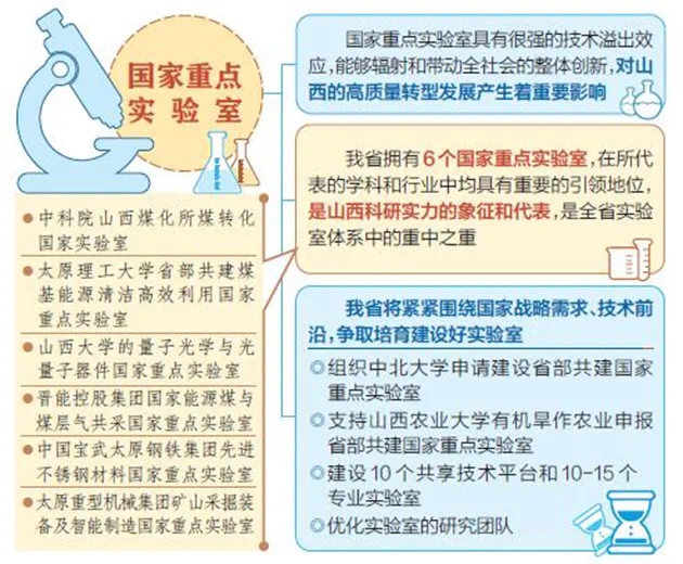 近年来,我省坚持以创新驱动高质量发展,重点实验室建设迎来了新高峰。国家重点实验室也成为区域创新发展新的战略制高点。省科技厅实验室与平台基地建设处处长王元莒介绍说,我省将紧紧围绕国家战略需求、技术前沿,争取培育建设好实验室。组织中北大学申请建设省部共建国家重点实验室;支持山西农业大学有机旱作农业申报省部共建国家重点实验室;建设10个共享技术平台和10-15个专业实验室;优化实验室的研究团队。