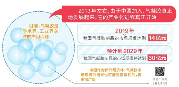 当前,气凝胶产业已经成为新材料产业领域争相竞逐的产业高地。浙江大学高分子科学与工程学系教授高超介绍,上世纪美国首次制备出气凝胶。由于工艺复杂及成本太高,只是被应用到少数的宇航服、太空服装几个尖端领域。2013年左右,由于中国加入,气凝胶算是真正地发展起来,它的产业化进程真正开始。目前来看,气凝胶是学术界、工业界关注的热门话题,2019年我国气凝胶制品的市场规模达到14亿元,预计到2029年,规模将达到30亿元,中国作为新兴经济体,它的增长也可能是指数性的,气凝胶市场的规模将更加广阔。