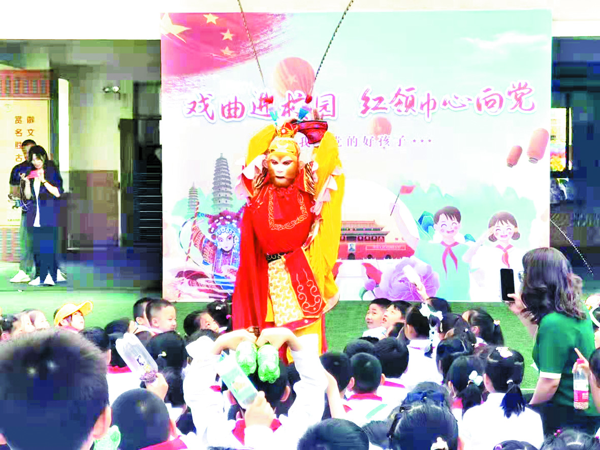 5月31日,山西省晋剧院青年演员为太原市迎泽区滨河小学师生表演“美猴王——孙悟空”。当日,太原市迎泽区滨河小学和山西省晋剧院联合举办“戏曲进校园 红领巾心向党”六一活动,为学生送上六一礼物的同时,带领小学生感受传统戏曲艺术,品味中国传统文化。