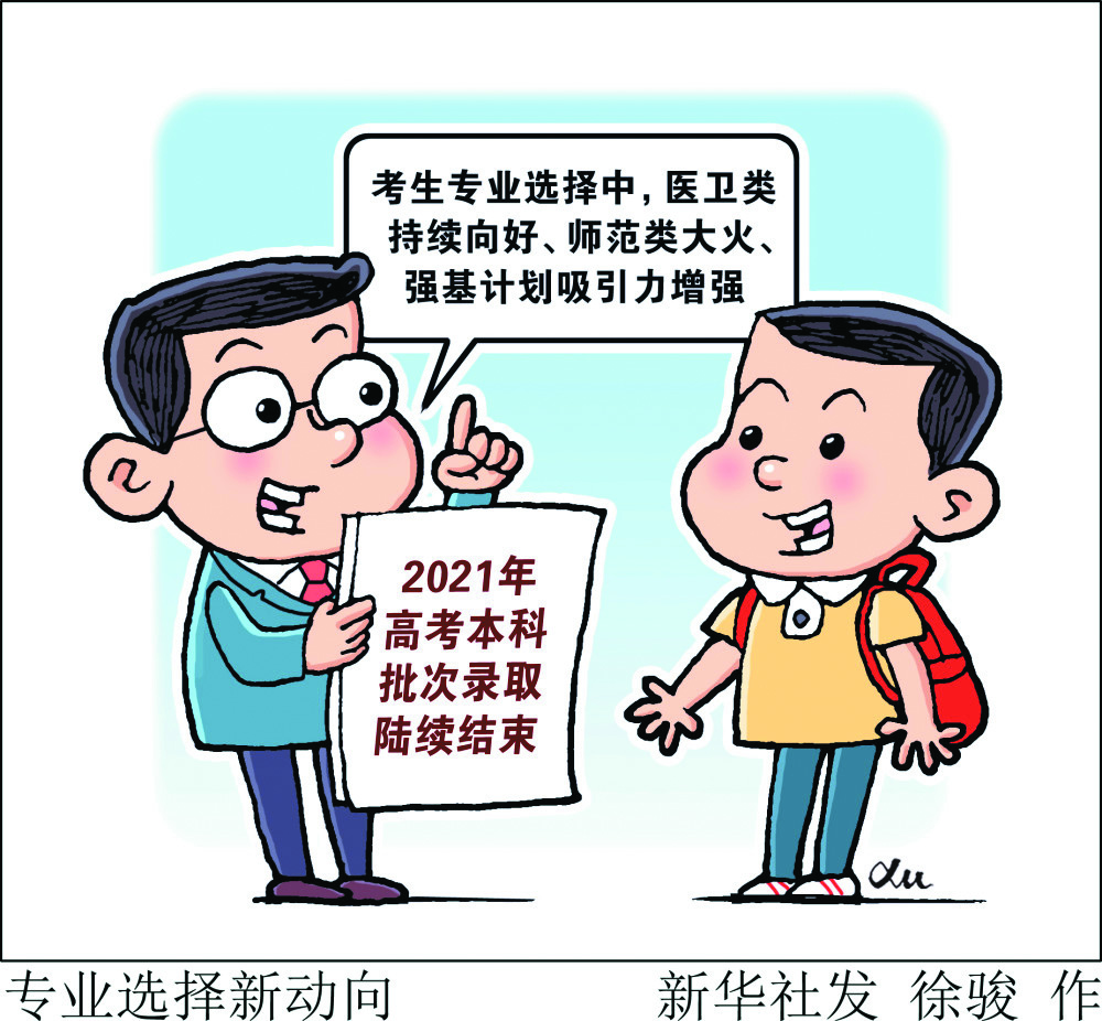 新华社电 目前,各地2021年高考本科批次录取陆续结束。今年考生专业选择中,医卫类持续向好、师范类大火、强基计划吸引力增强。“新华视点”记者采访发现,在专业选择与职业预期呈现强相关特点的同时,考生个人志趣、对未来产业的前瞻等越来越成为志愿选择的关键因素。